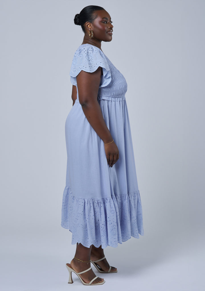 Featuring a soft flutter sleeve and tiered hem with scalloped broderie anglaise detail and deep v neckline. A contemporary weekend casual dress, the Anastasia Broderie Midi Dress by Something 4 Olivia is designed with a shirred bodice fit to allow for maximum comfort.