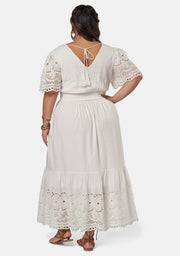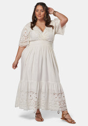 Featuring a deep V neckline, tiered hem silhouette with intricate broderie anglaise detailing on the bodice and hem. Introducing the Blowin In The Wind Maxi Dress from The Poetic Gypsy.