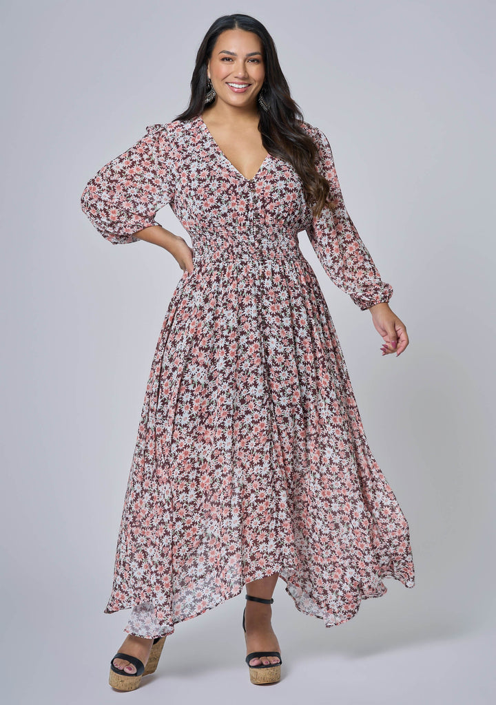 Designed with a handkerchief hem and delicate fabric, the Bohemian Harmony Maxi Dress by The Poetic Gypsy channels relaxed elegance. A shirred waist, 3/4 sleeves and mock button front complete the autumnal feel.