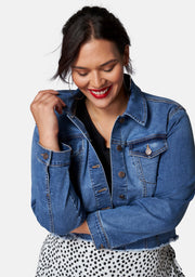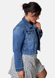 With twin front pockets and mid wash finish, make this style yours wearing it with your Maze Skirt. In a relaxed crop fit with raw edge detail the Sunday In The City Chatterbox Crop Denim Jacket will keep your style on point this season.