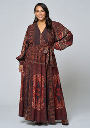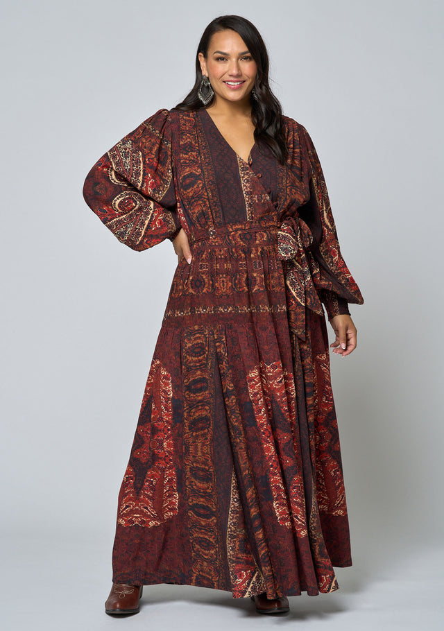 Featuring an oversized blouson sleeve and an easy to wear tapestry print in an empire silhouette. The Crystal Visions Maxi Dress from The Poetic Gypsy, features a deep V neckline, self tie at waist and full A-line skirt.