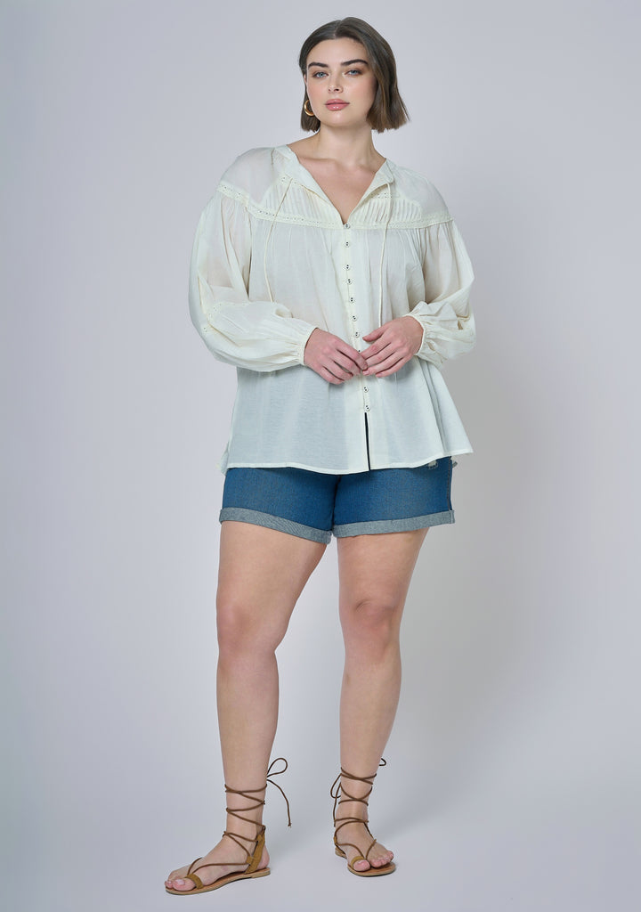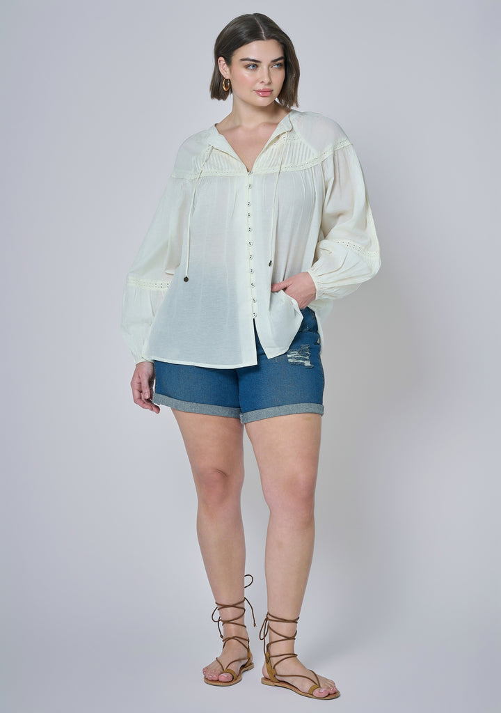 Laced with dreamlike details, the Ethereal Oasis Blouse by The Poetic Gypsy channels vintage charm with pintuck pleats, soft ties, and a button-through front. Its relaxed shape and delicate lace trims make it a standout layering piece for boho outfitting.