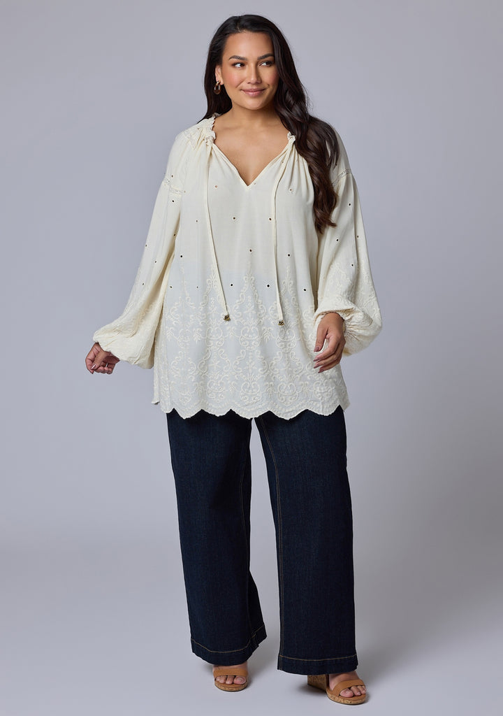 The Genevieve Blouseby Something 4 Olivia is a masterpiece of refined design, made with exquisite cotton broderie fabrication. Delicate full length sleeves paired with a neck tie make this blouse versatile and apt for any occasion.