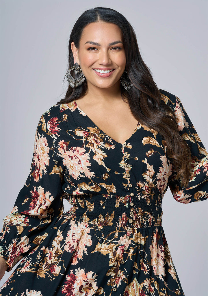 A hanky hem silhouette on the hem finishes this style off. Long sleeves designed with a gathered cuff detail, the Gypsy Child Maxi Dressby The Poetic Gypsy, features a deep V neckline, shirred waist and button through detail.