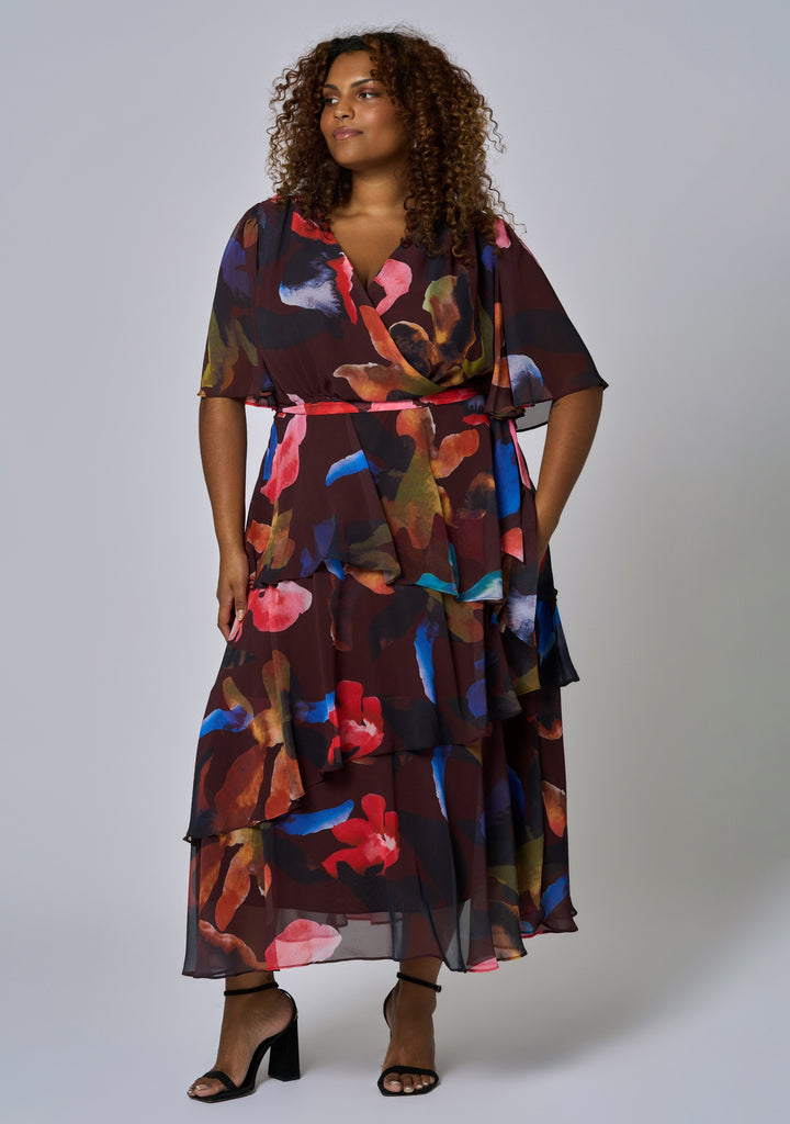 Crafted from a delicate woven cloth in an on-trend print, this dress features a layered skirt silhouette, wrap neckline and flutter sleeves for that ultimate wow factor. The Hypnotic Maxi Dress from Pink Dusk pays homage to the must have dress.