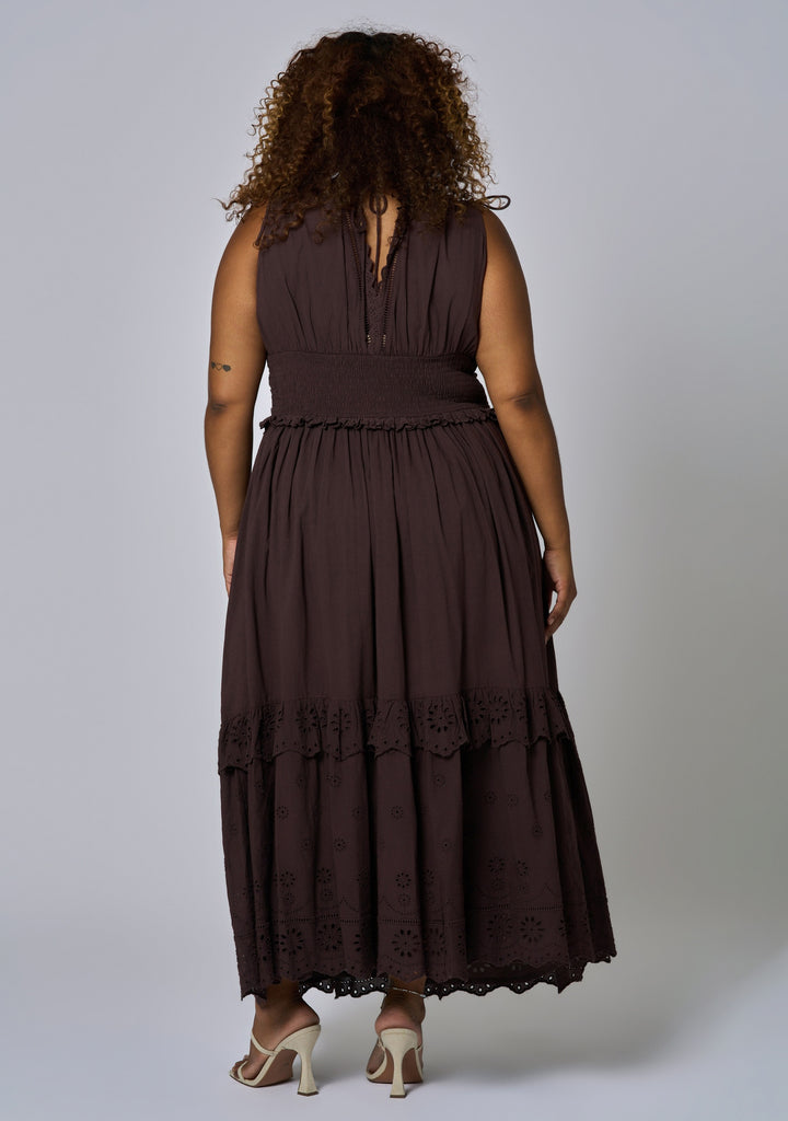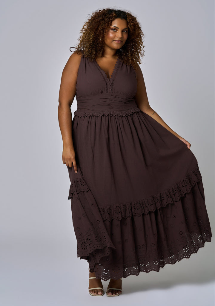 The Lucinda Maxi Dress by Something 4 Olivia is designed in a rich mahogany hue with soft lace trim and a tiered, floaty skirt. Crafted from premium cotton, its shirred waist and sleeveless cut make it effortlessly polished for any refined occasion.