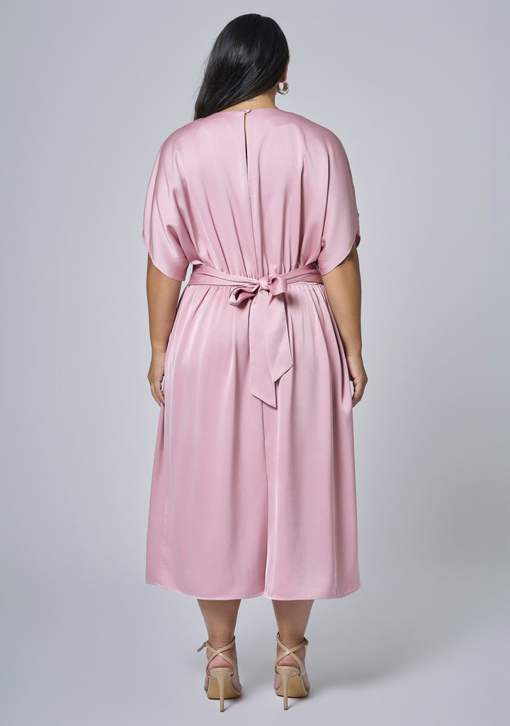 Satin sophistication defines the Lust Unleashed Satin Midi Dress by Pink Dusk, with its luxe drape and high neckline. It’s a statement in elegance with a tie waist that flatters the form.