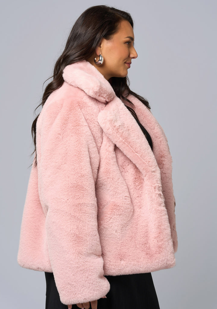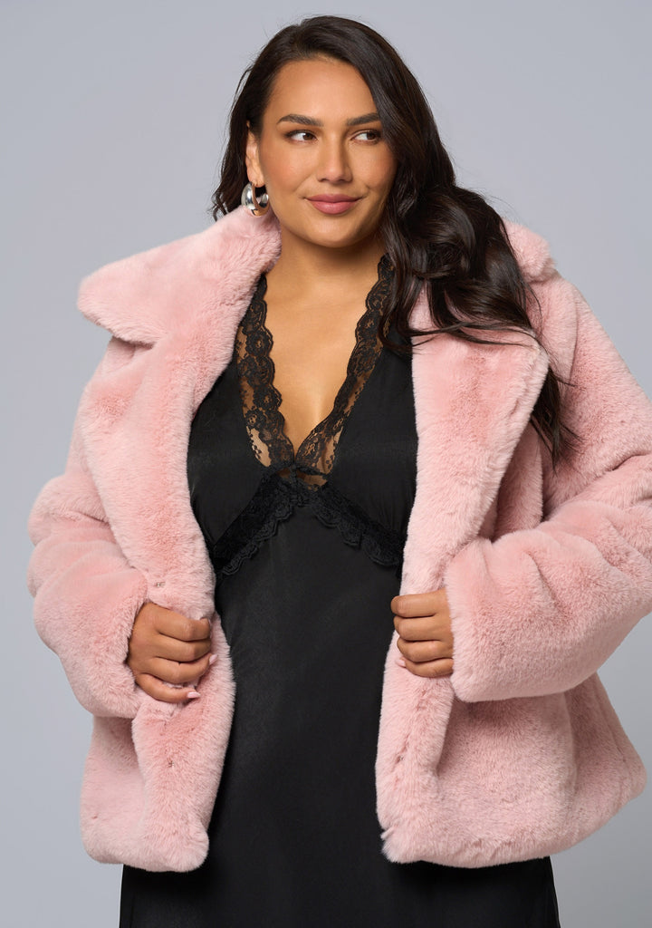 Plush texture meets playful attitude in the Midnight Aura Fur Jacket by Sunday In The City, designed in soft pink faux fur. A cosy collar and statement silhouette make it the ultimate finishing touch for after-dark outfits.