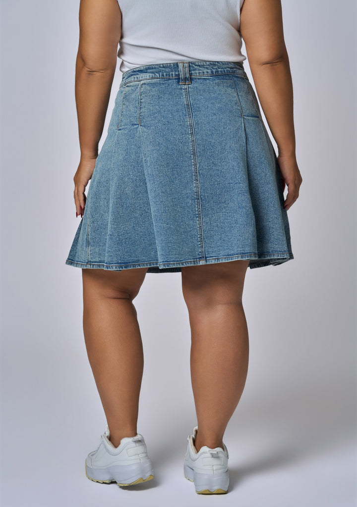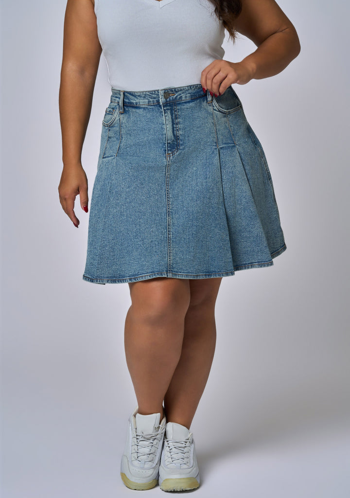 The Paige Denim Mini Skirt from Indigo Tonic is updating the basic denim skirt with a flirty pleated a line silhouette in a mid washed denim. Constructed from a cotton rich stretch denim, this skirt will fit all shapes.
