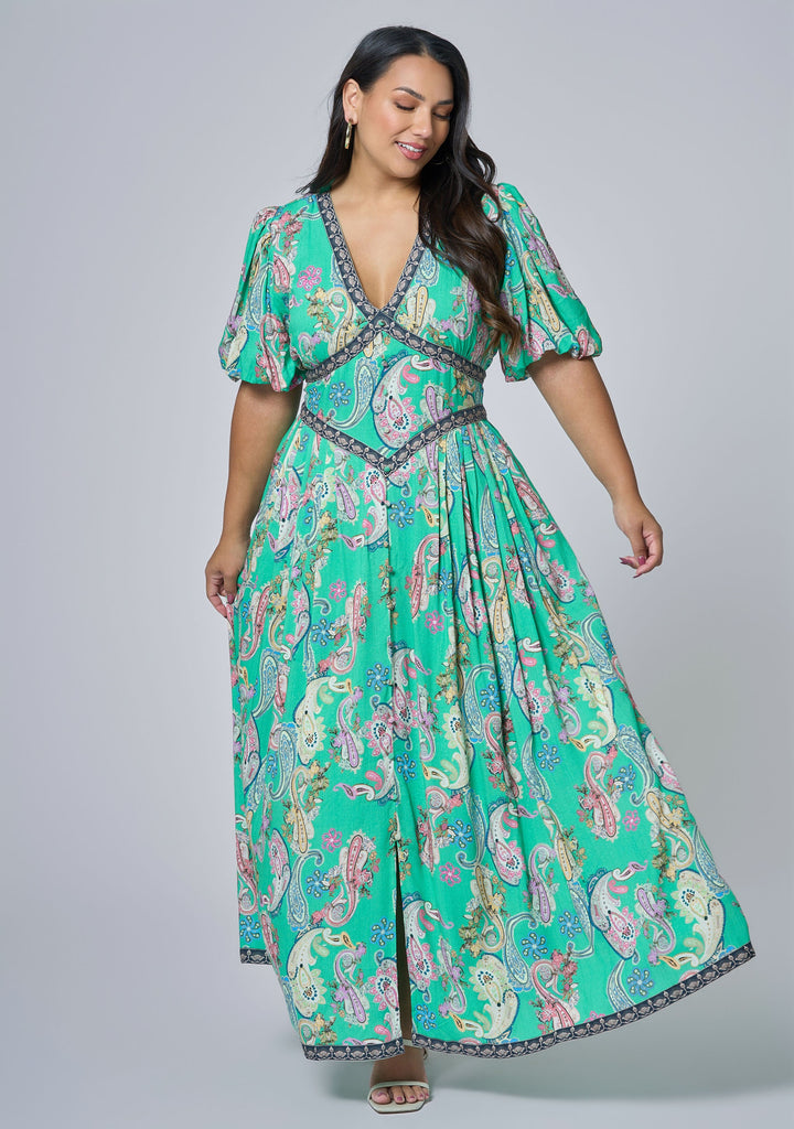Vibrant and flattering, the Rose Maxi Dress by Something 4 Olivia is defined by its puff sleeves, v-neckline and beautifully textured print. A tailored waist panel and sweeping hem add polish and presence.