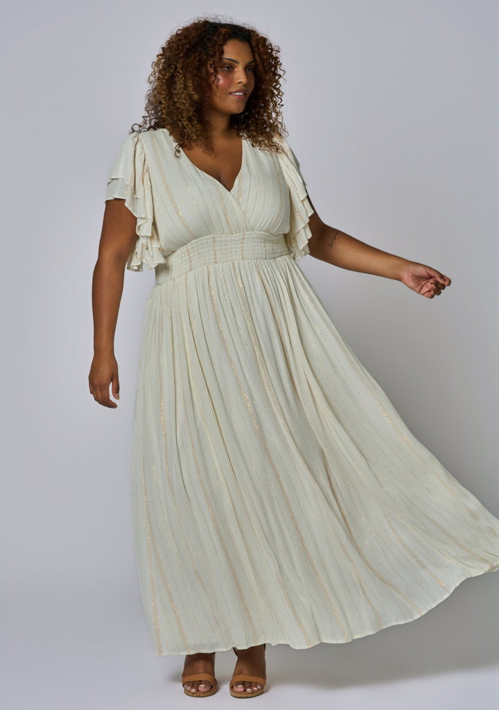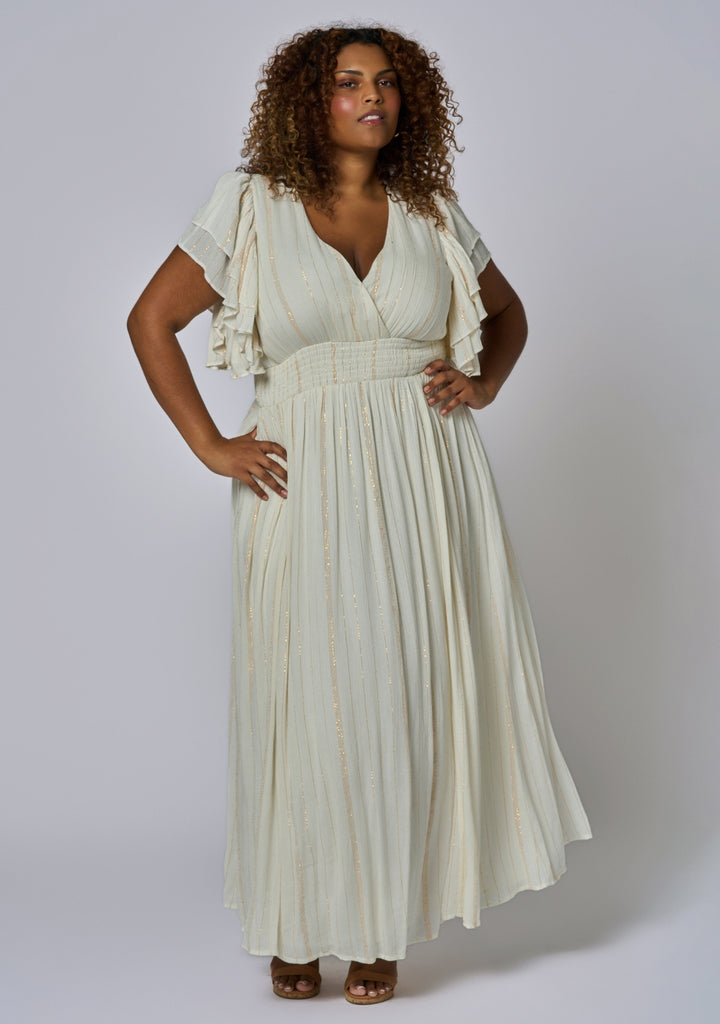 Shimmer subtly in the Stardust Maxi Dress by The Poetic Gypsy, complete with floaty layered sleeves and gold lurex detail. A soft v-neckline and full skirt lend gentle drama to the off white base.