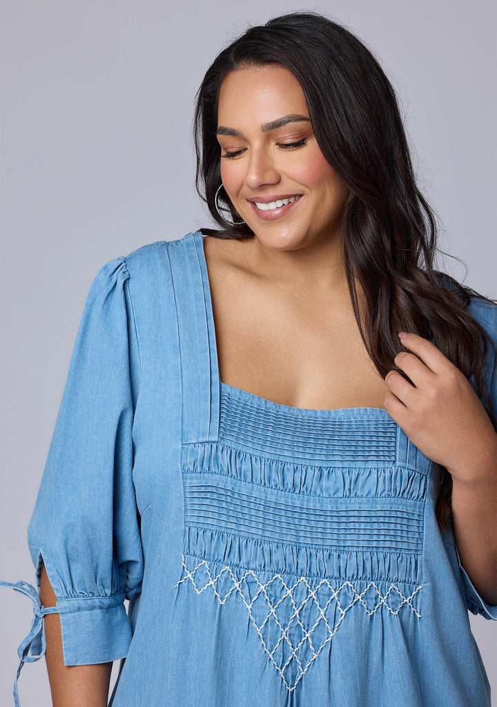 Cool and considered, the Verity Chambray Mini Dressby Indigo Tonic features a square neckline, ¾ sleeves with tie-up cuffs, and pintuck detailing at the chest. Crafted in breathable cotton chambray, it’s a relaxed fit style designed for effortless everyday wear.